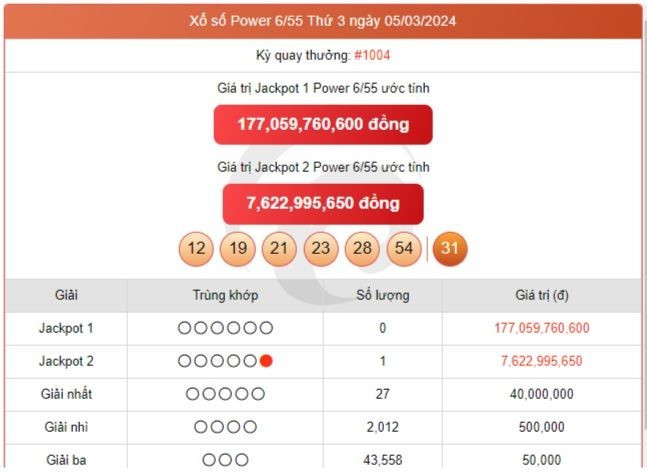Giải Jackpot: trùng khớp 6 số, giải thưởng trị giá tối thiểu 12 tỷ đồng và tích lũy.