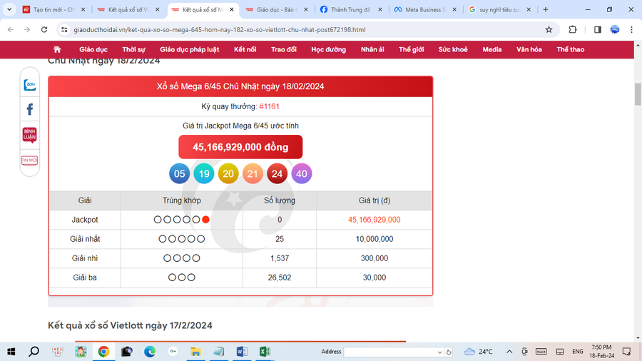 Báo Giáo dục và Thời đại cập nhật kết quả xổ số hôm nay - Xổ số Vietlott Max 3D thứ 2 ngày 19/2/2024 nhanh và chính xác.