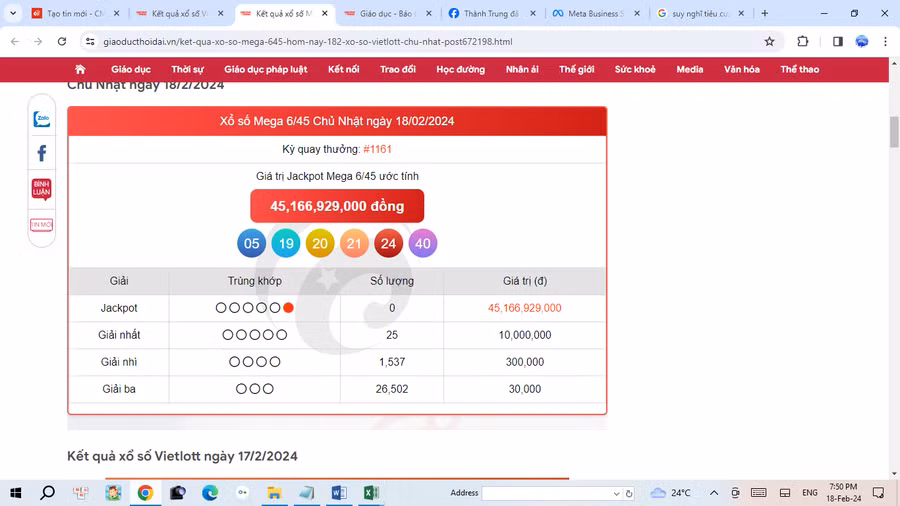 Kết quả xổ số Vietlott ngày 18/2/2024