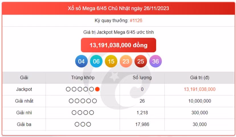 Kết quả xổ số Vietlott Chủ Nhật ngày 26/11/2023