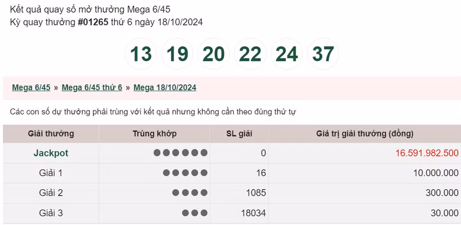 Kết quả xổ số Vietlott ngày 18/10/2024