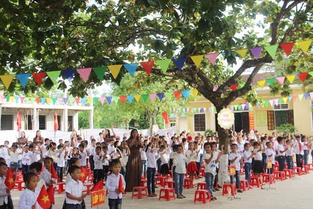 Tại Trường tiểu học Hương Đô (huyện Hương Khê), đúng 7h sáng hơn 300 học sinh, giáo viên với trang phục chỉnh tề, cờ hoa rực rỡ có mặt sớm tại trường để đón chào năm học mới.