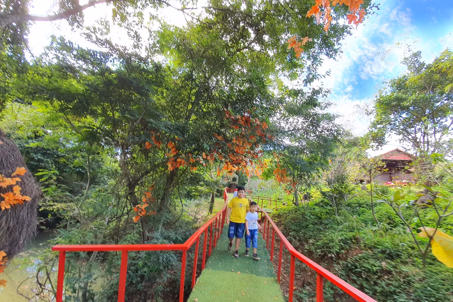 | Mỗi góc cây cầu gỗ sơn đỏ bắc qua hồ nước, xích đu tổ chim phong cách Bali hay những chiếc lốp xe cũ sặc sỡ màu sắc đều được trang trí bắt mắt phục vụ nhu cầu 'sống ảo' của du khách. |