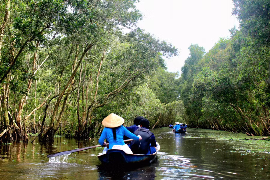 | Du khách tham quan trải nghiệm rừng tràm Trà Sư bằng xuồng. (Ảnh: Trọng Nhân). |