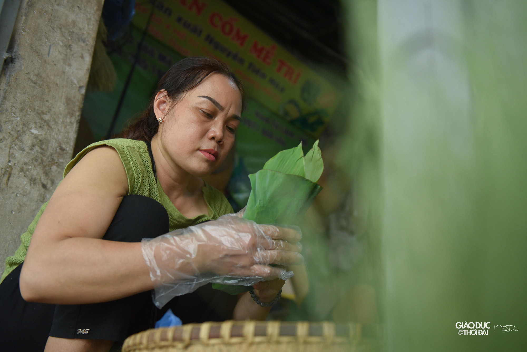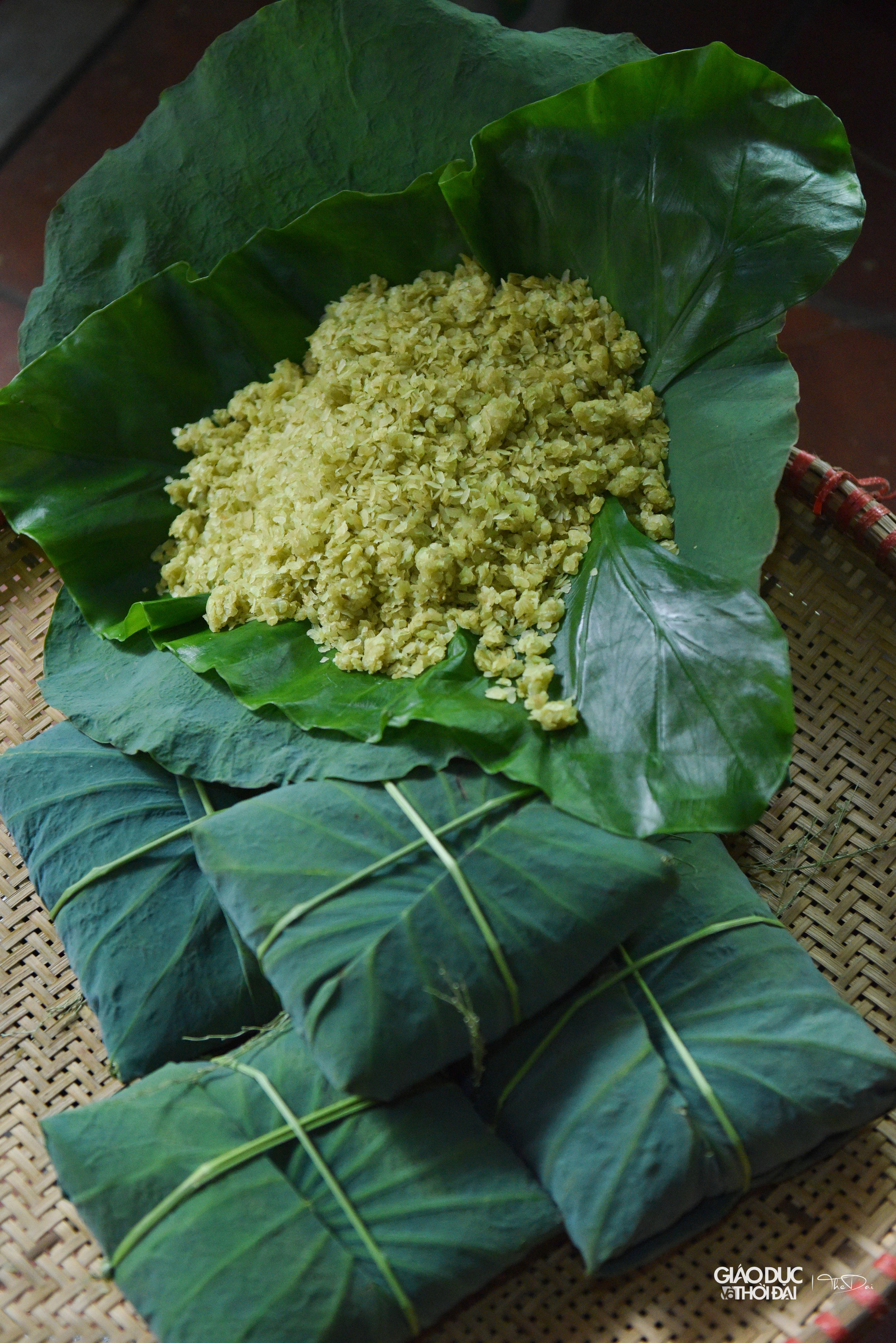 | Những hạt cốm sau khi được hoàn thành sẽ được gói tỉ mỉ bằng lá sen để giữ hương vị, rồi buộc lại bằng những cọng rơm xanh bắt mắt. |