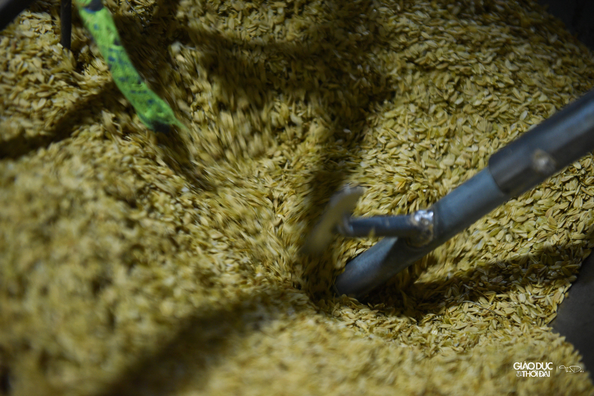 | Trong suốt quá trình rang, người dân phải canh lửa điều chỉnh liên tục lửa để hạt thóc vừa đẹp, vừa không bị sống, không bị vụn. Ước lượng miết tay hạt lúa mềm, dẻo là đủ độ. |
