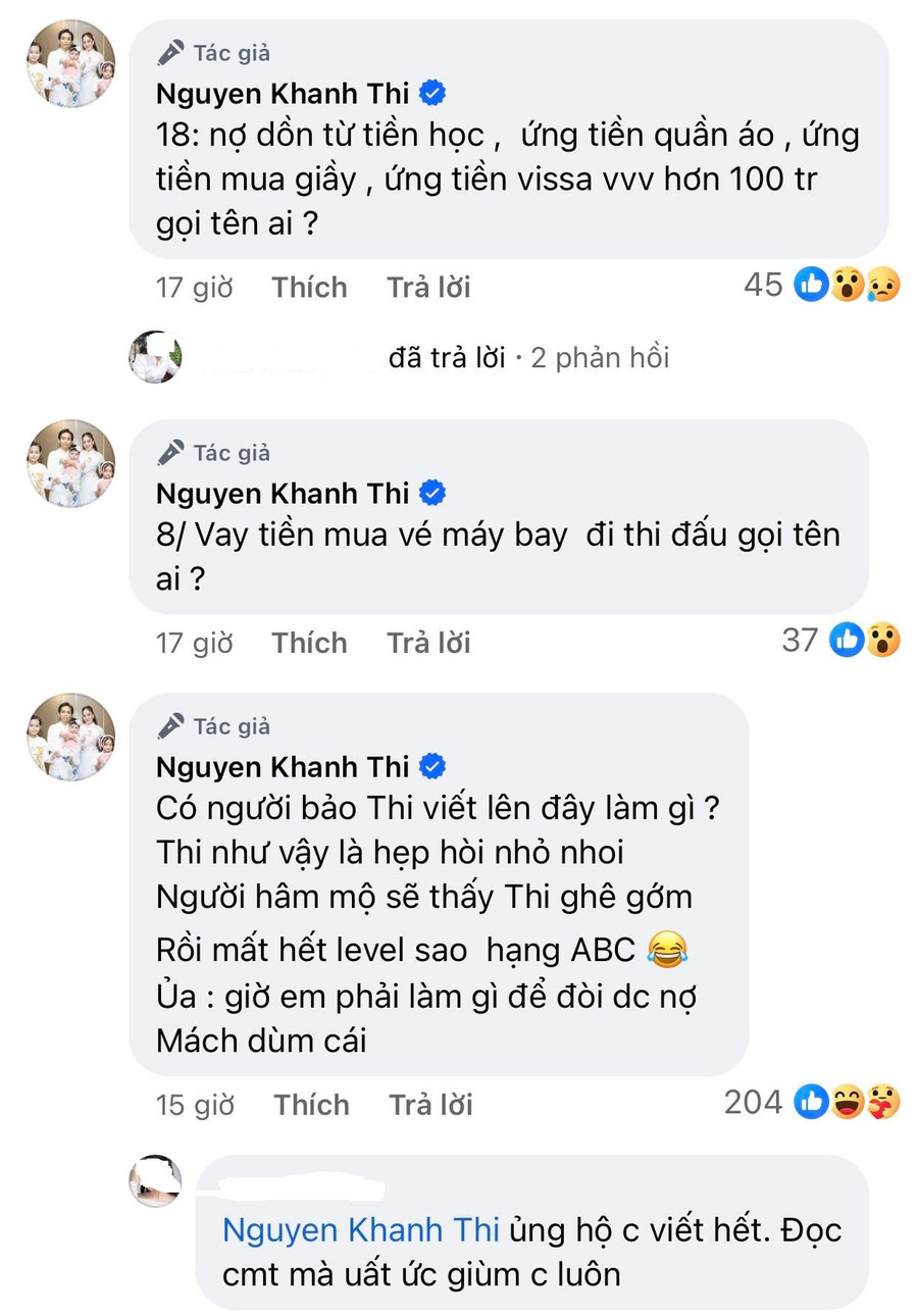 Bên dưới phần bình luận, Khánh Thi liệt kê hàng loạt trường hợp nợ tiền của mình. Trong đó, có một người nợ cô lên đến 500 triệu đồng.