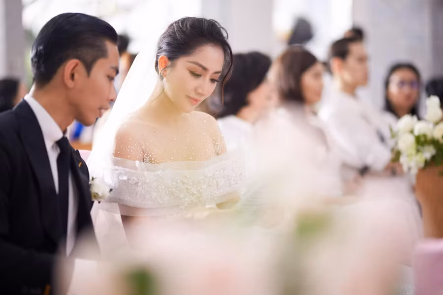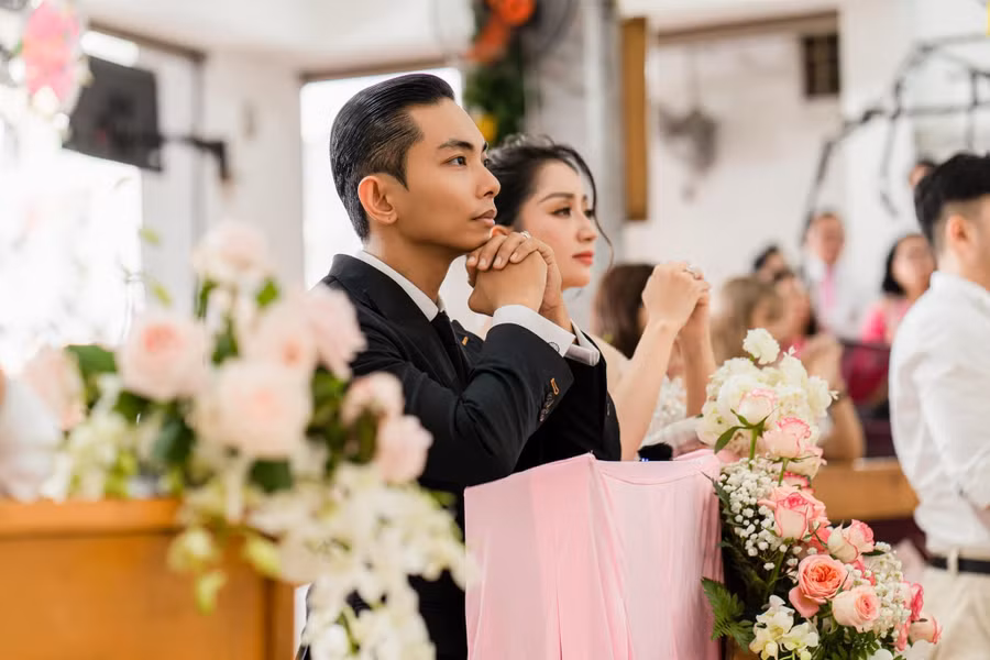 Mới đây, người bạn thân thiết của Khánh Thi và Phan Hiển là MC Nguyên Khang đã chia sẻ những khoảnh khắc đám cưới tại nhà thờ của cặp đôi kiện tướng.