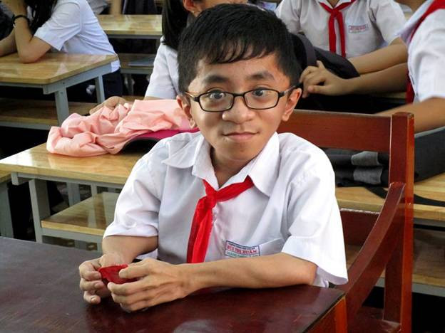 Ngay cả chiếc bàn học của Thiện trong lớp cũng phải thiết kế riêng để phù hợp với dáng ngồi của em.