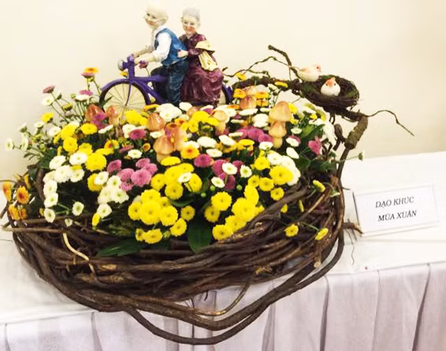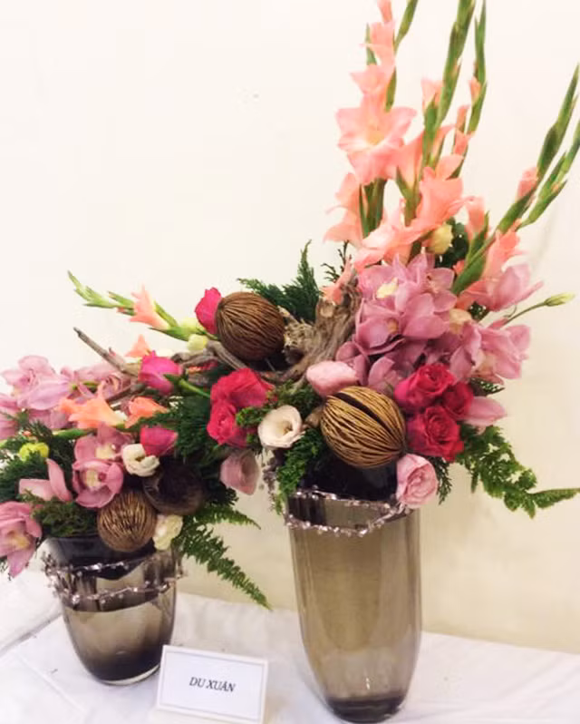 Ngoài các loại hoa như tulip, cúc, lan... cô Bích Vân còn sử dụng những vật liệu tái chế như mo dừa, mo cau, vỏ trứng, gốc cây khô... để tạo hình cho bình hoa vô cùng độc đáo và lạ mắt.