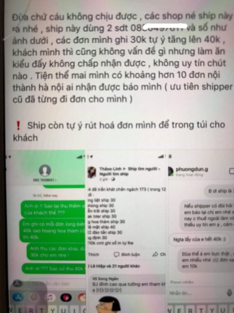 Có anh shipper, khách yêu cầu thu tiền hàng là 500.000 đồng, và tiền ship là 30.000 đồng. Nhưng đến lại báo cho khách là thu 600.000 tiền hàng, hỏi hóa đơn thì bảo shop không đưa. Thậm chí, nhiều khách cũng không kịp hỏi giá tiền chênh vì mua online nhiều cũng không nhớ là mặt hàng đó hết bao nhiêu, shipper báo giá nào thì trả giá đó.
