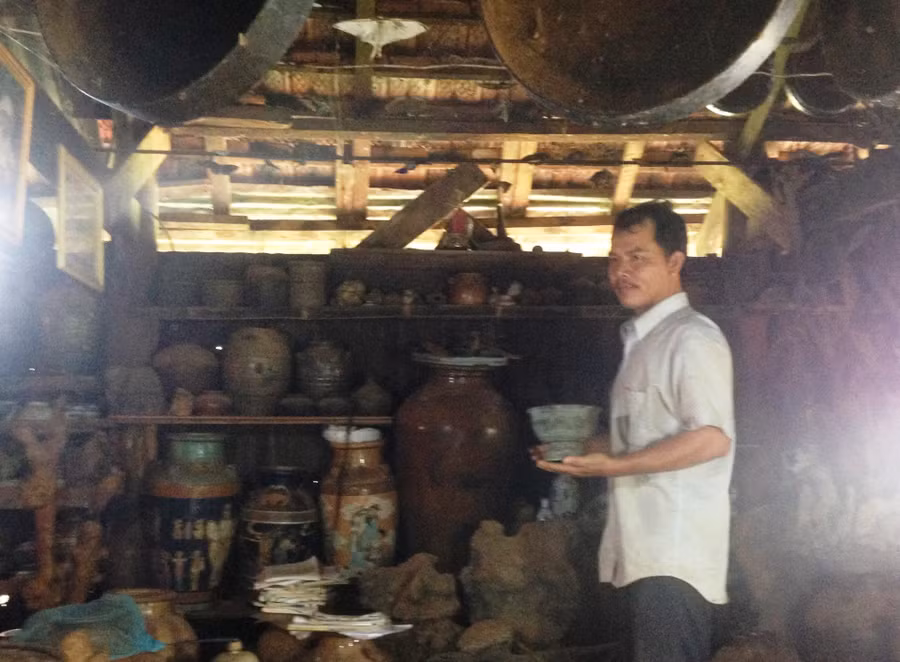 Hiện vật đầu tiên tôi sở hữu là một cái ché. Những năm đó, có một già làng, ông dặn con cháu khi mất thì chôn bộ ché theo. Hay tin, tôi tức tốc đến nhà thuyết phục ông hãy giữ lại, còn không thì bán lại cho tôi. Nói mãi, ông cũng đồng ý để lại nhưng đòi phải đổi con bò to béo. Tôi dắt con bò của nhà đến để đổi, nhưng ông không đồng ý mà đòi đi chọn con khác. Tôi đưa ông ấy đi khắp làng, ông chọn con to khỏe lấy, tôi đành phải mượn tiền mua con đó cho ông, anh Hưng tâm sự.