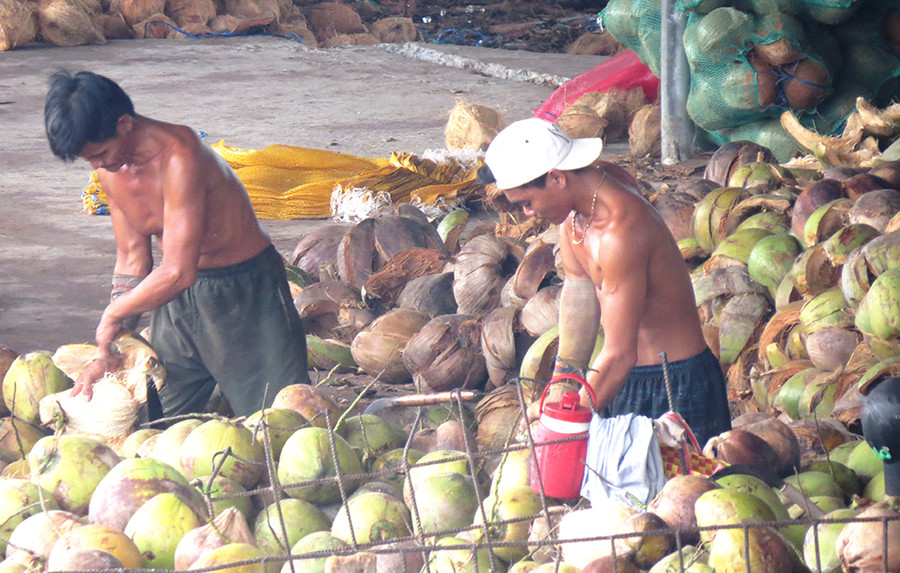 Tại một vựa dừa ở xã An Thạnh (huyện Mỏ Cày Nam, Bến Tre) nằm gần ngã ba sông Thơm, bên cạnh “núi dừa” với hàng chục ngàn trái xếp chồng lên nhau cao như quả núi, hàng chục công nhân, phần nhiều là nữ đang lặng lẽ với công việc lột vỏ dừa.