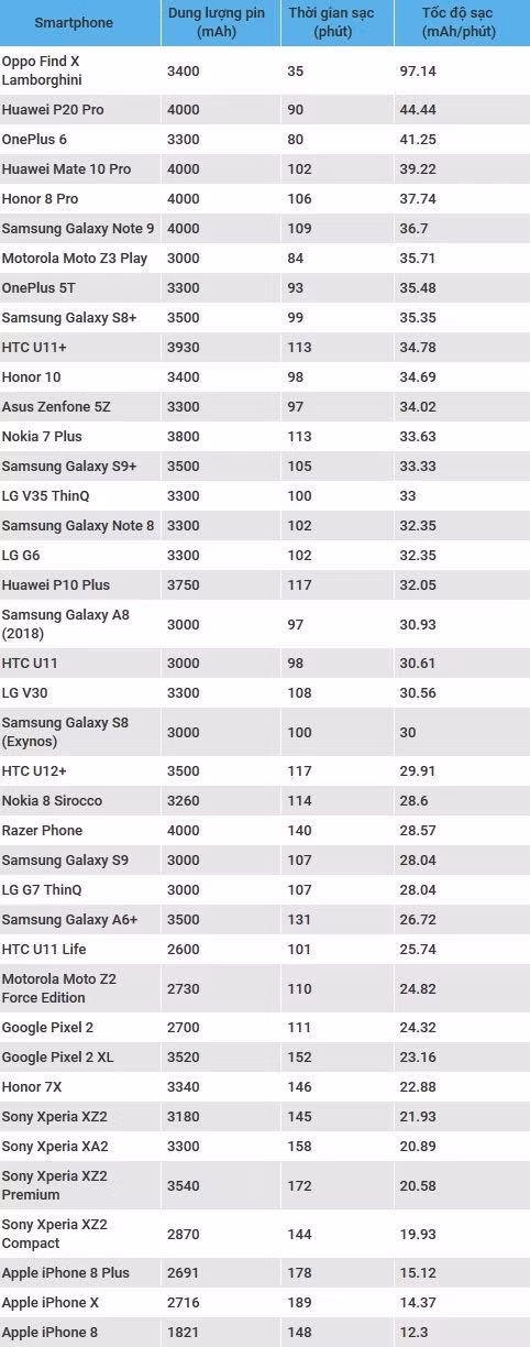 Để trả lời câu hỏi này, trang PhoneArena đã tiến hành thử nghiệm và đưa ra bảng xếp hạng những chiếc smartphone cao cấp sạc nhanh nhất lẫn chậm nhất qua mỗi mAh trung bình được nạp vào trong 1 phút.