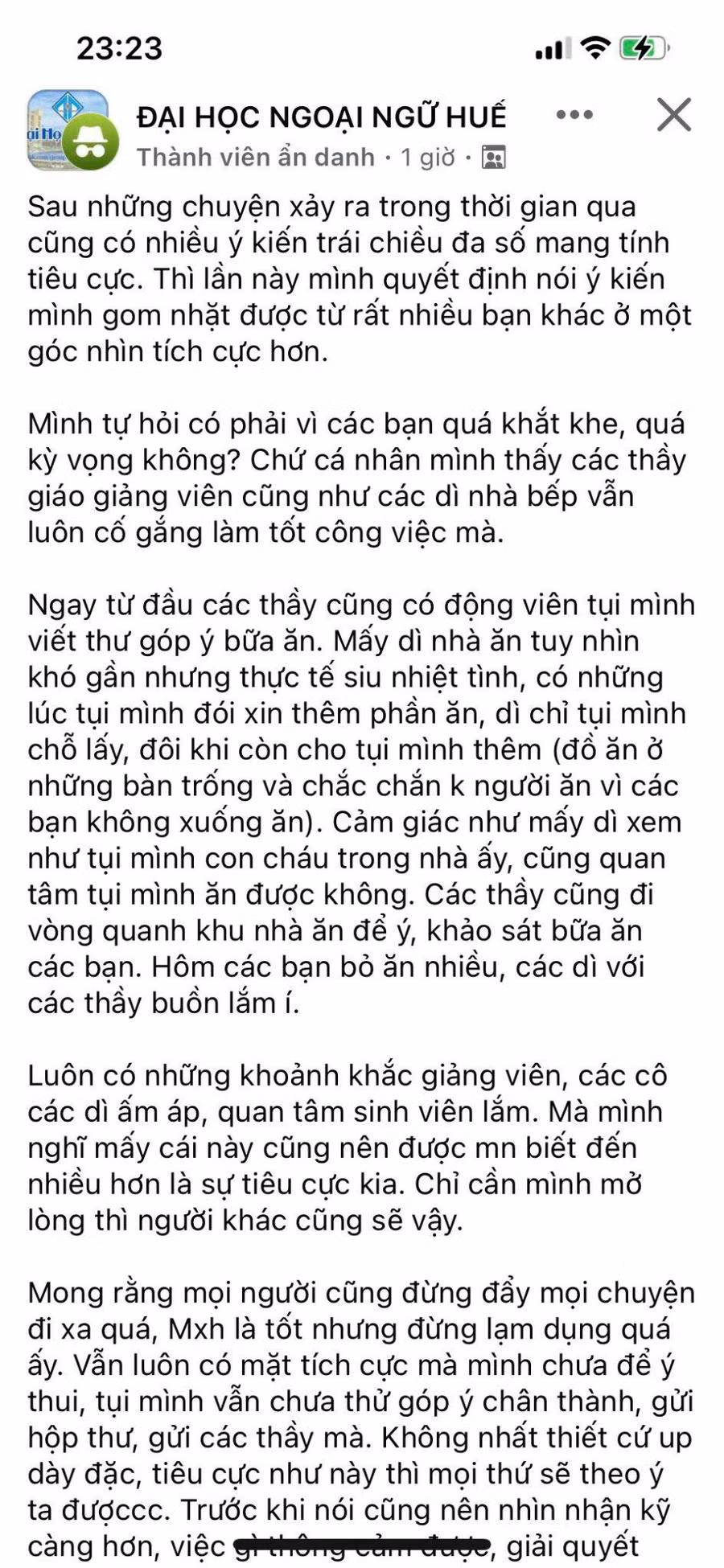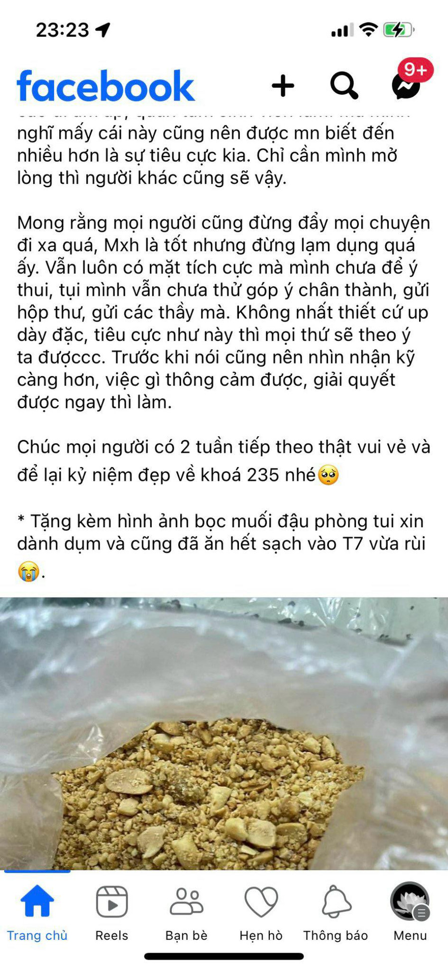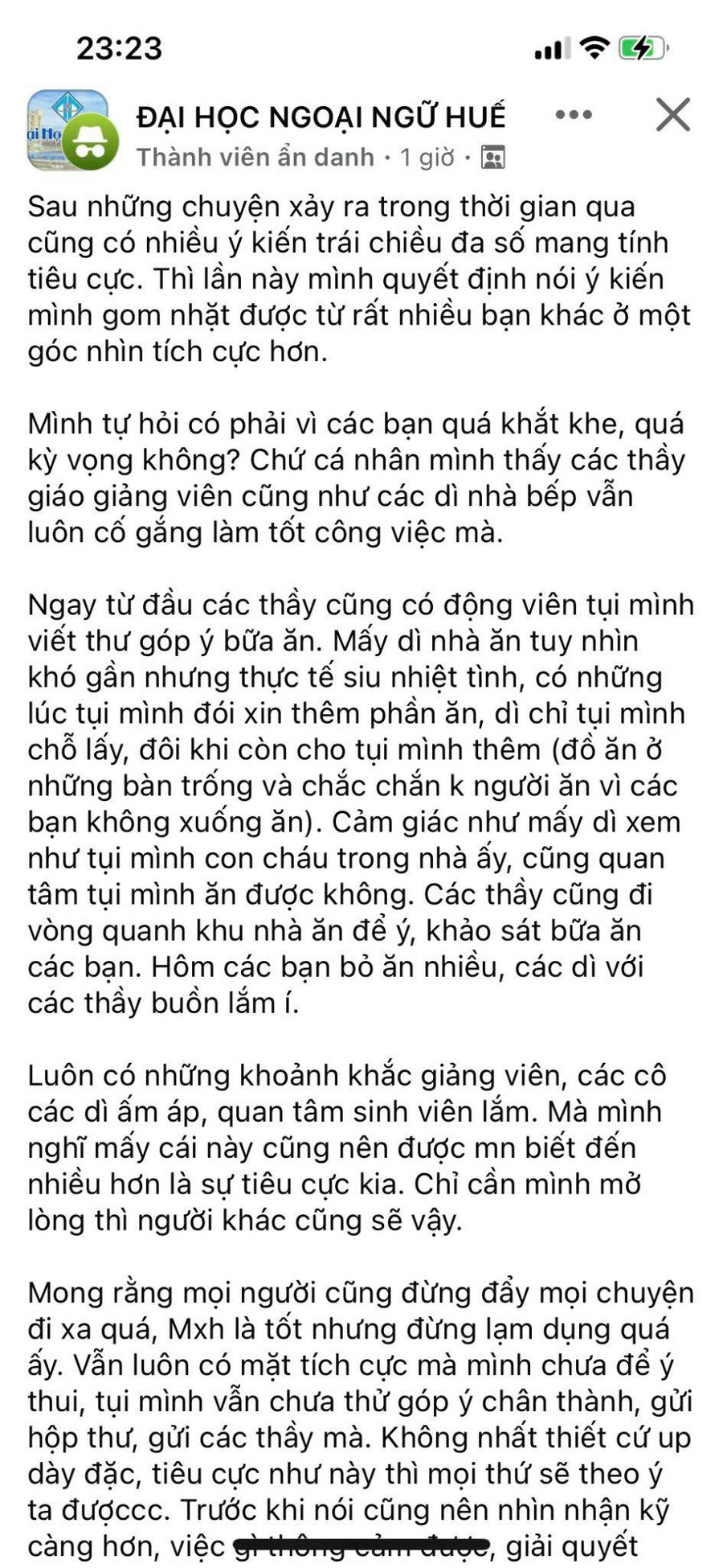 Mong rằng mọi người cũng đừng đẩy mọi chuyện đi xa quá, mạng xã hội là tốt nhưng đừng lạm dụng quá. Vẫn luôn có mặt tích cực mà mình chưa để ý thui, tụi mình vẫn chưa thử góp ý chân thành, gửi hộp thư, gửi các thầy mà. Không nhất thiết cứ up dày đặc, tiêu cực như này thì mọi thứ sẽ theo ý ta được. Trước khi nói cũng nên nhìn nhận kỹ càng hơn, việc gì thông cảm được, giải quyết.