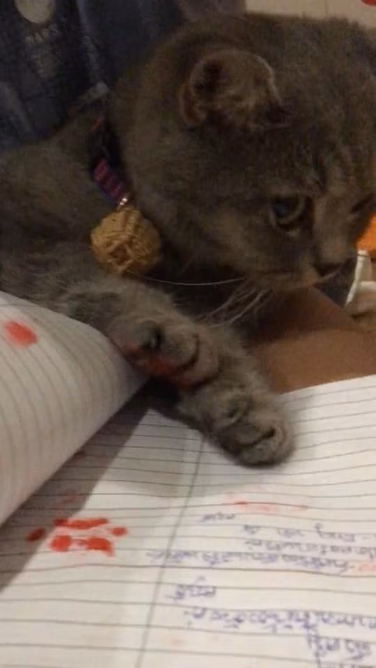 Vì mèo không thể cầm bút nên cậu bé quệt son đỏ rồi đặt bàn chân mèo cho in lên sổ.