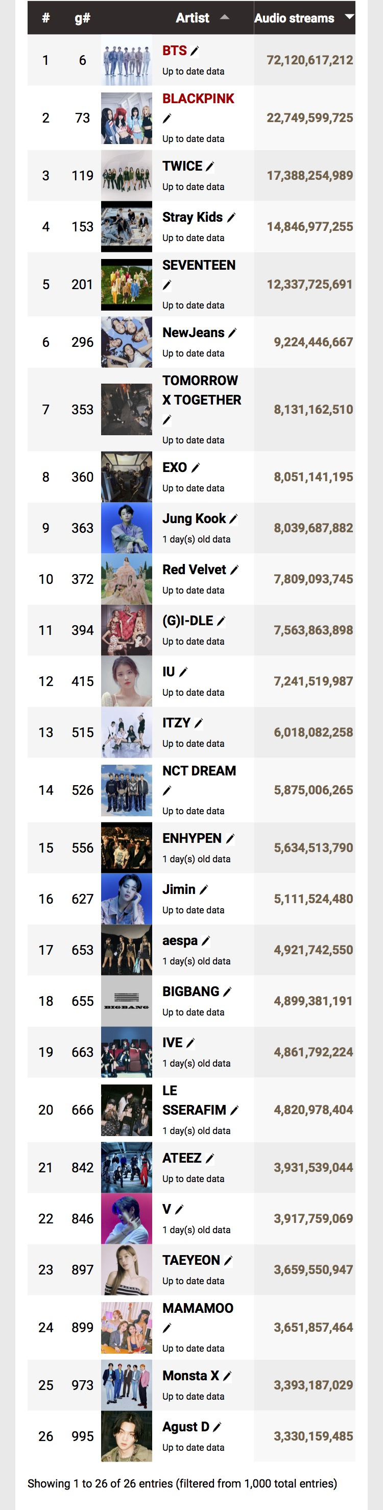 Chainmasters gần đây đã công bố bảng xếp hạng các nghệ sĩ K-pop được phát trực tuyến nhiều nhất trên các nền tảng ở nước ngoài.