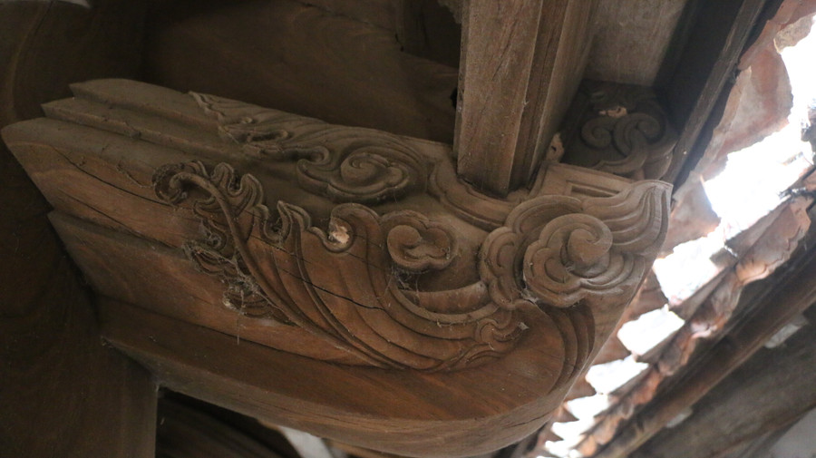 | Các cấu kiện gỗ như xà, kẻ hiên hay y môn, cửa võng đều được người xưa bào trơn, đóng bén, soi gờ kẻ chỉ và tạo hình sống động. |