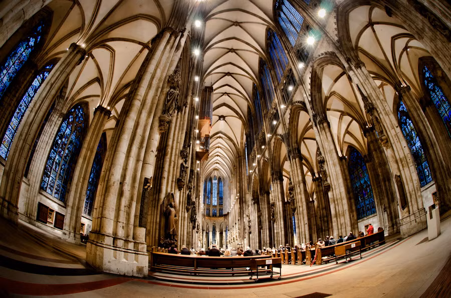 Bên trong nhà thờ, cả bốn bức tường bao quanh đều được vẽ tranh và lắp đặt các cửa sổ kính pha lê màu. Trong nhà thờ có 5 quả chuông, trong đó có quả chuông St. Peter 24 tấn là nặng nhất. Đứng trên tháp chuông này, bạn có thể thưởng thức phong cảnh mỹ lệ của thành phố Cologne và dòng sông Rhine kiều diễm.