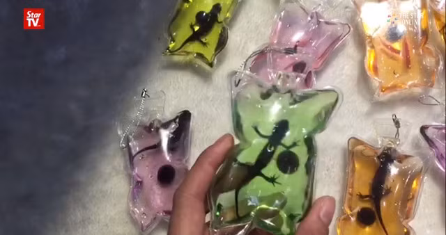 Cận cảnh loại móc chìa khóa kỳ dị với những con thằn lằn còn sống.