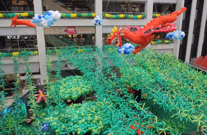 "Công viên khủng long" trên được làm từ 600.000 quả bóng bay với nhiều màu sắc.