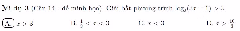 Từ các đáp án trên, chúng ta có thể phân hoạch tập số thực. Sau đó, chúng ta chỉ còn chọn trong mỗi tập trên một đại diện để xét. Chẳng hạn, x = 0,1, 3.2, 4. Ta chỉ cần tính giá trị log2 (3x - 1) tại các điểm đó và so sánh với số 3 để kết luận.
