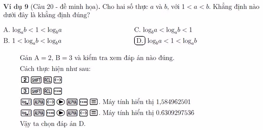 Với câu này, học sinh có thể giải theo kiểu thông thường (dùng định nghĩa logarit) hoặc SHIFT CALC. Tuy nhiên, khi có sẵn các đáp án học sinh có thể dùng phím CALC để tìm được đáp án chính xác như sau: