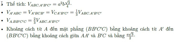 - Khối lăng trụ tam giác đều cạnh đáy bằng a, cạnh bên bằng b: