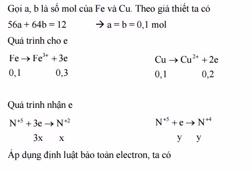 Ví dụ 2: Hoàn tan hoàn toàn 12g hỗn hợp Fe, Cu (tỉ lệ mol 1:1) bằng HNO3 thu được V lít hỗn hợp khí X (đktc) gồm NO, NO2. Tỉ khối của X so với H2 là 19.