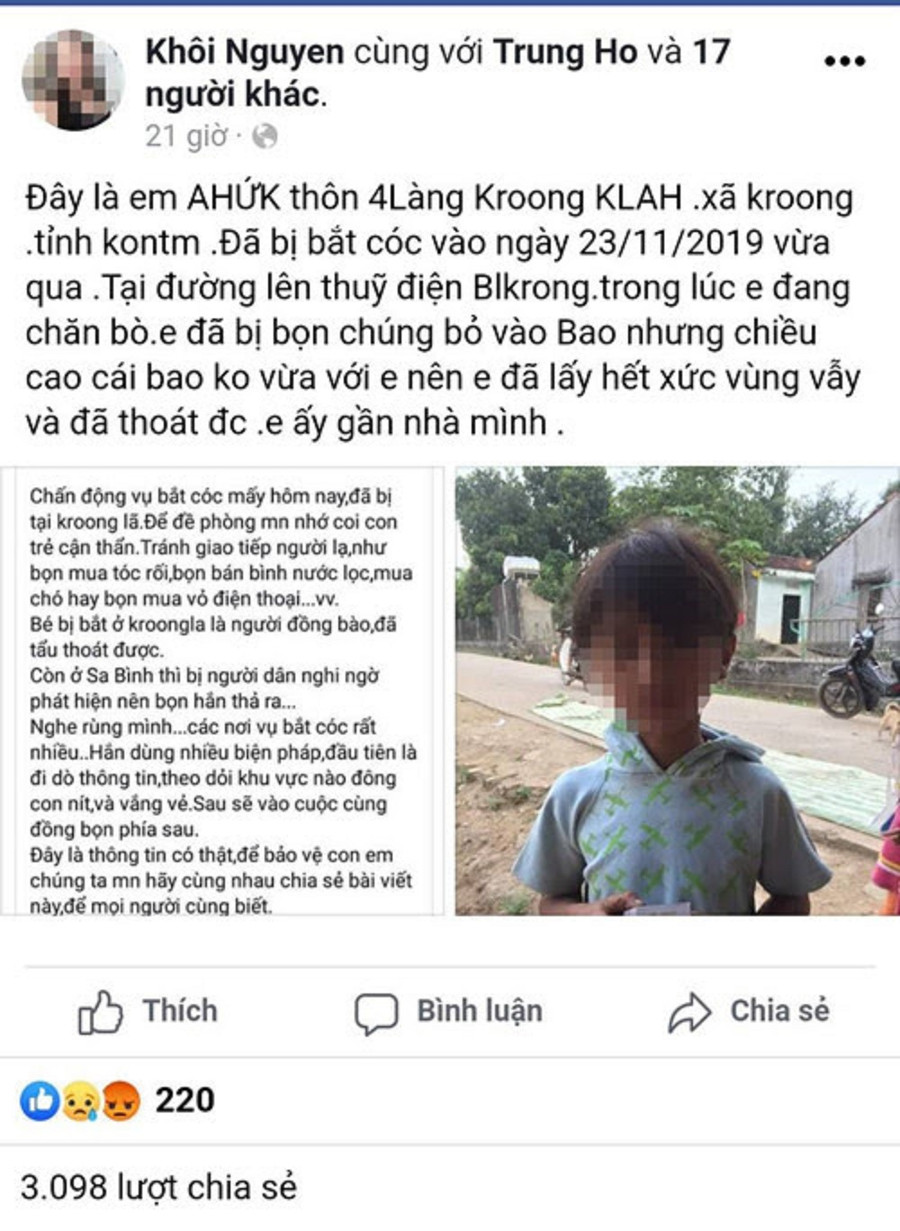 Trước đó, tài khoản Facebook Khôi Nguyễn có đăng tải bài viết với nội dung, ngày 23/11, em A Hưk (11 tuổi, trú thôn 4, làng Kroong Klah, xã Kroong) đang đi chăn bò thì bị bắt cóc bỏ vào bao. Tuy nhiên, nạn nhân đã vùng vẫy nên thoát ra được. Tài khoản này còn khẳng định đây là thông tin có thật và kêu gọi mọi người chia sẻ để cảnh giác.