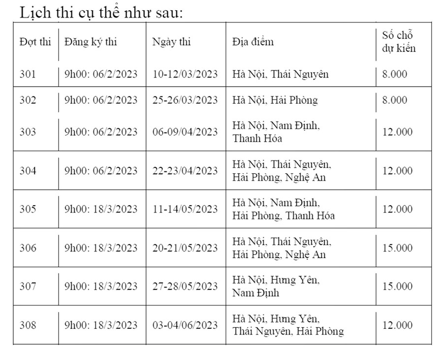 Kỳ thi này dự kiến tổ chức 2 đợt. Đợt 1 vào ngày Chủ nhật (26/3) và đợt 2 vào ngày Chủ nhật (28/5). Cổng đăng ký dự thi (đợt 1) sẽ được ĐH Quốc gia TP Hồ Chí Minh mở vào ngày 1/2 trên trang https://thinangluc.vnuhcm.edu.vn.