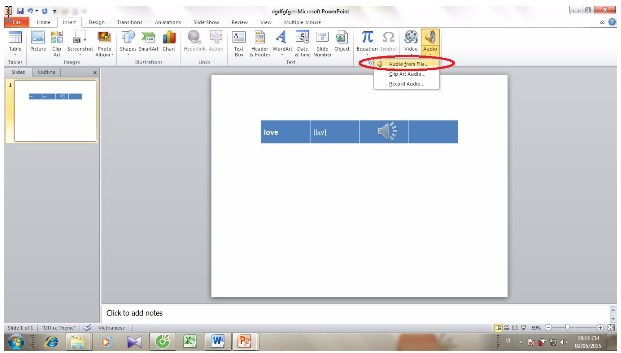 Bước 4: mở bài giảng, chọn Insert -> Audio -> Audio from file, chọn file đã lưu âm thanh, ấn ok và chèn vào trong bài giảng.