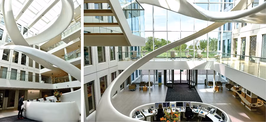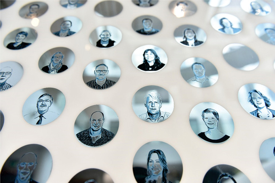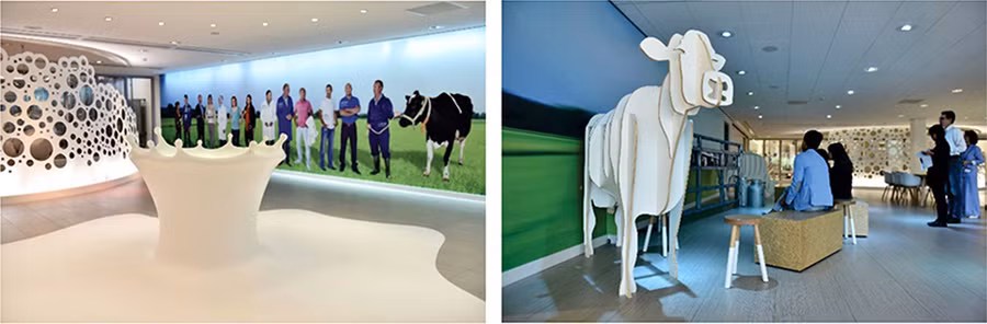 Phía sau quầy lễ tân là bức tường với hàng trăm khuôn mặt nhân viên được in theo dạng âm bản. Theo bà Ingrid Mol - Giám đốc Nghiên cứu và Phát triển của Tập đoàn FrieslandCampina, bức tường này thể hiện sự trân trọng và đề cao yếu tố con người trong sự phát triển của tập đoàn.