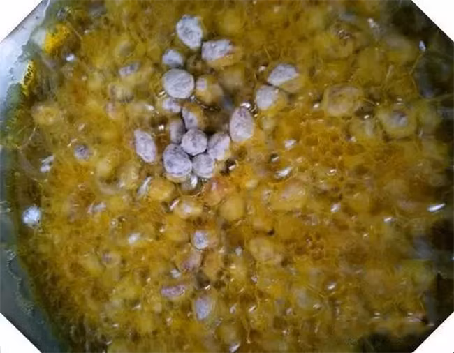 Đun nóng chảo dầu ở lửa nhỏ. Dầu cần ngập chảo và rán lạc trong khoảng 10 phút. (Ảnh: sohu)