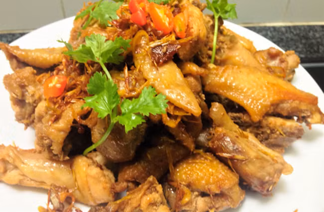 – Rán gà sao cho chín vàng đều hai mặt, khi gà chín thì vớt riêng ra dĩa.
