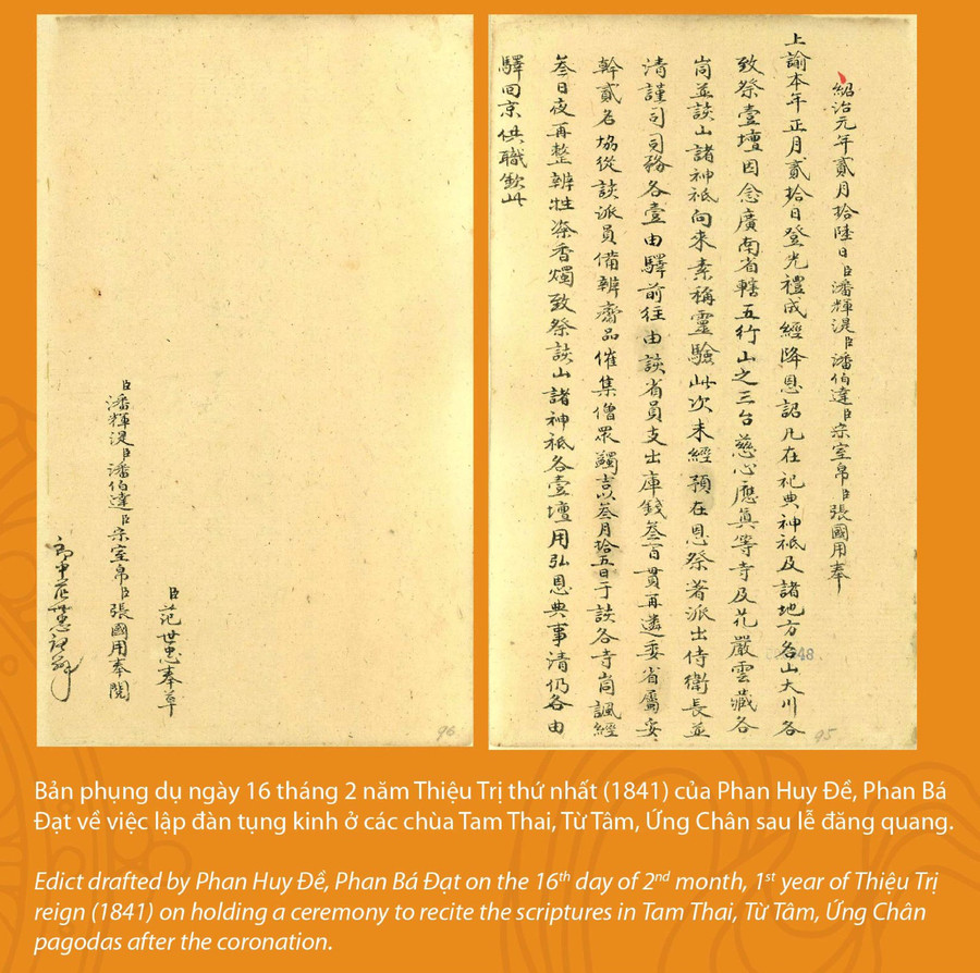 Thời Nguyễn giai đoạn đầu, Phật giáo khá phát triển, nhiều chùa chiền được xây dựng mới, hoặc trùng tu và trở thành những trung tâm tín ngưỡng của đông đảo người Việt. Một bản dụ vào ngày 16/2/1841 (Thiệu Trị thứ nhất) của Phan Huy Đề, Phan Bá Đạt đề đạt việc lập đàn tụng kinh ở chùa Tam Thai, Từ Tâm, Ứng Chân sau lễ đăng quang.