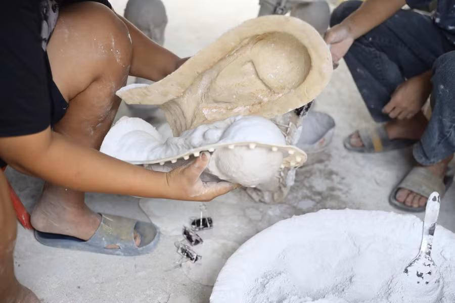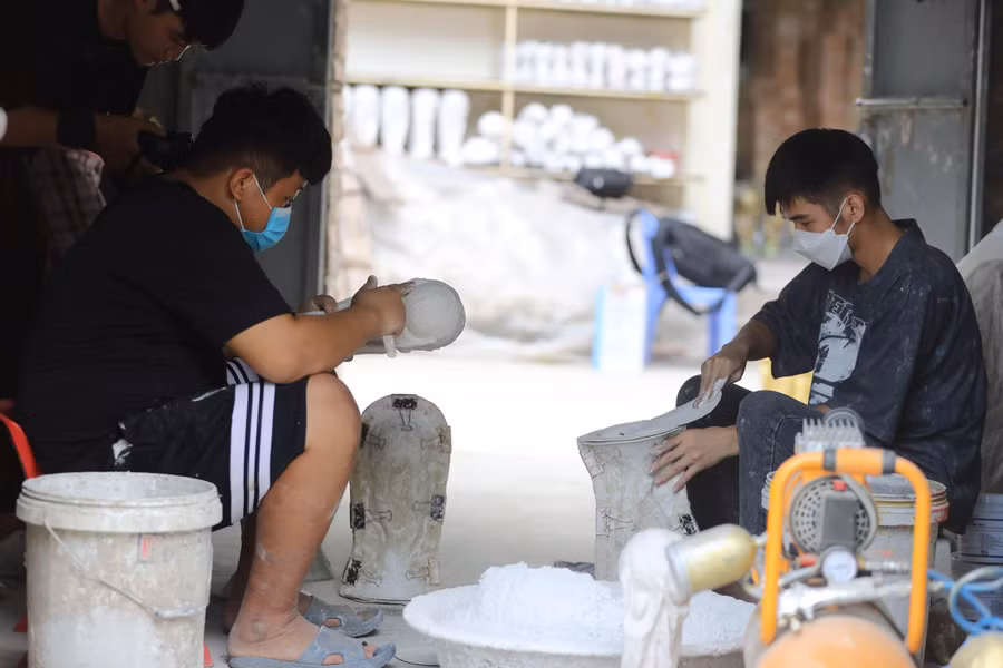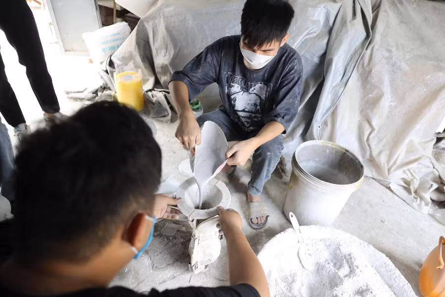| Sau khi tháo khuôn, người thợ tiếp tục cắt bỏ những chi tiết thừa rồi mang chiếc cúp đi phơi khô, Sau khi phơi khô thời gian từ 3-5 ngày, người thợ mang cúp vào sơn phủ các lớp màu và nhũ. |