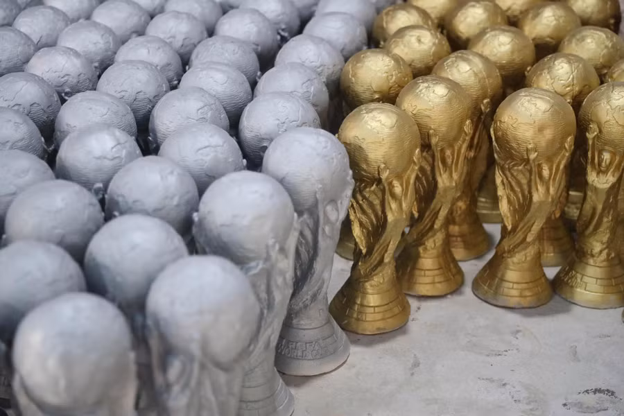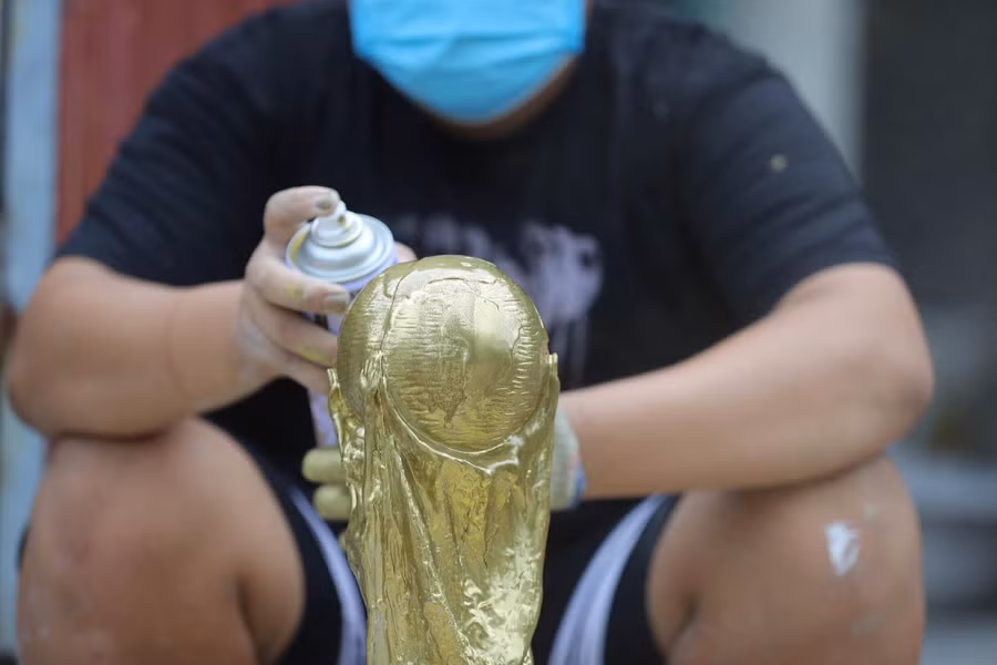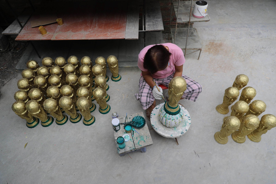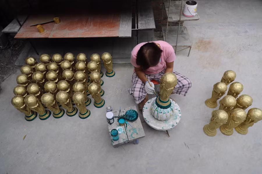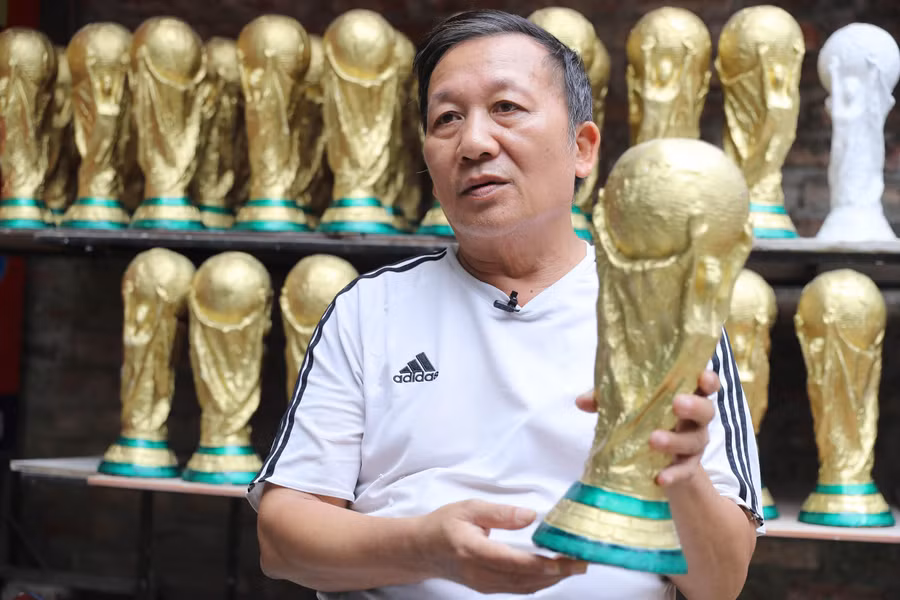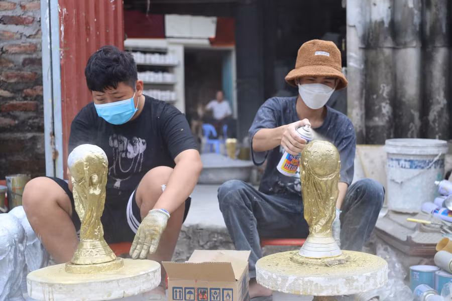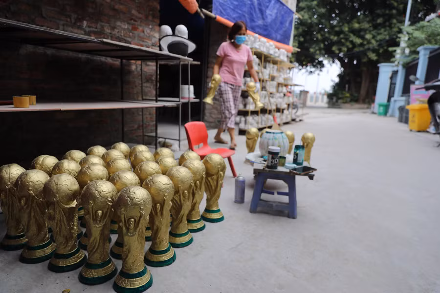 Trước ngày khai mạc vòng chung kết World Cup 2022, nhiều cơ sở sản xuất gốm tại xã Bát Tràng (Hà Nội) đã cho ra đời những chiếc 'cúp vàng World Cup 2022' để phục vụ niềm đam mê của người hâm mộ bóng đá.