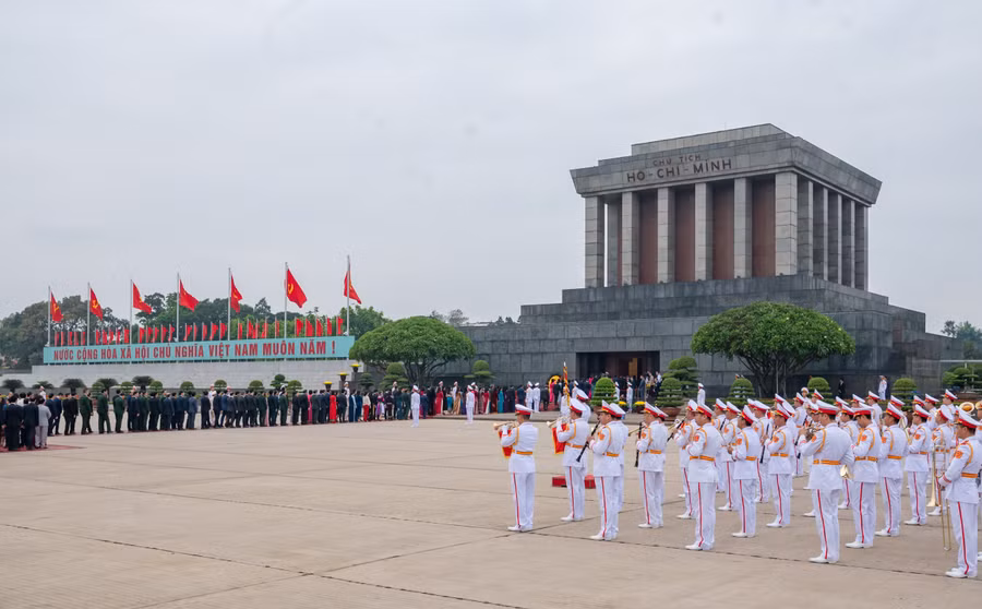Trong tiếng quân nhạc trang nghiêm, các lãnh đạo Đảng, Nhà nước, các Đại biểu Quốc hội kính cẩn nghiêng mình, tỏ lòng biết ơn vô hạn, lòng thành kính tưởng nhớ công lao to lớn của Chủ tịch Hồ Chí Minh đối với sự nghiệp đấu tranh giải phóng dân tộc, thống nhất đất nước, xây dựng Tổ quốc Việt Nam xã hội chủ nghĩa hòa bình, độc lập, thống nhất.