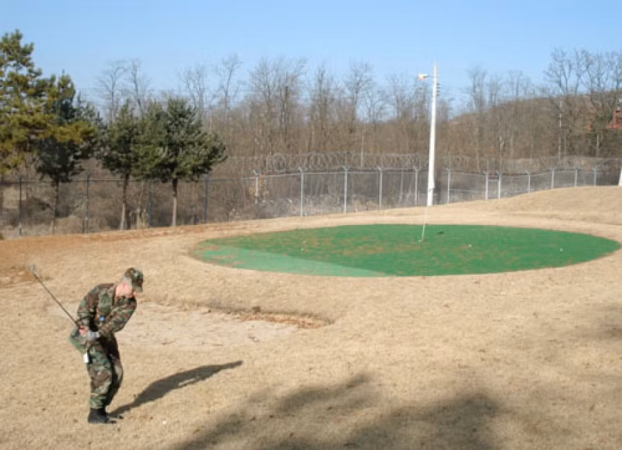 Cùng với một số sân golf ở Iraq, Afghanistan… Camp Boniffas của Hàn Quốc giáp danh Triều Tiên là sân golf nguy hiểm nhất thế giới.