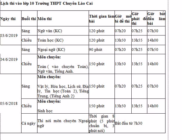 Thời gian thi từng môn cụ thể như sau: Môn Toán và môn Ngữ văn 120 phút; môn Ngoại ngữ 90 phút. Với các thí sinh thi vào Trường THPT Chuyên Lào Cai sẽ thi thêm môn chuyên với thời gian 150 phút; môn Ngoại ngữ ngoài thi lý thuyết còn có thêm phần thi nói (5 phút chuẩn bị, 3 phút nói).
