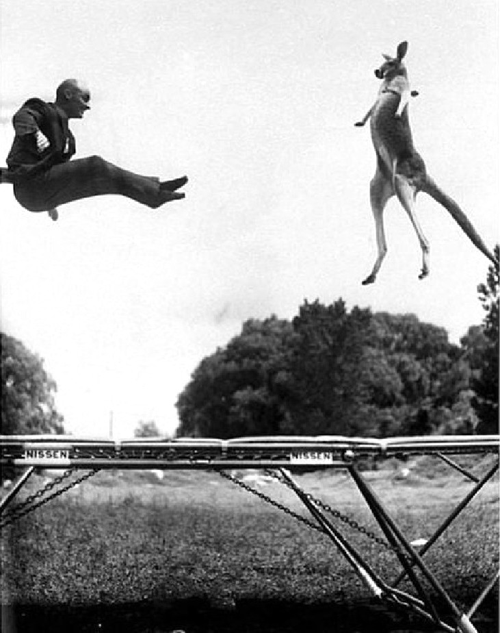 George Nissen là vận động viên thể dục dụng cụ và cũng là người phát minh ra bàn nhún trampoline vào thập niên 1930 từ lúc còn là học sinh trung học và tham gia đoàn xiếc Iowa Hawkeye Circus. Nhờ sáng kiến mới của anh mà các diễn viên xiếc có thể tạo dáng trên không dễ dàng mà không sợ tai nạn nếu bị rơi xuống. Nissen tiếp tục hoàn thiện trampoline và năm 1945 được cấp bằng sáng chế. Năm 1960, Nissen giới thiệu con kangaroo Victoria có thể nhảy trampoline cùng với ông tại Yonkers, New York.