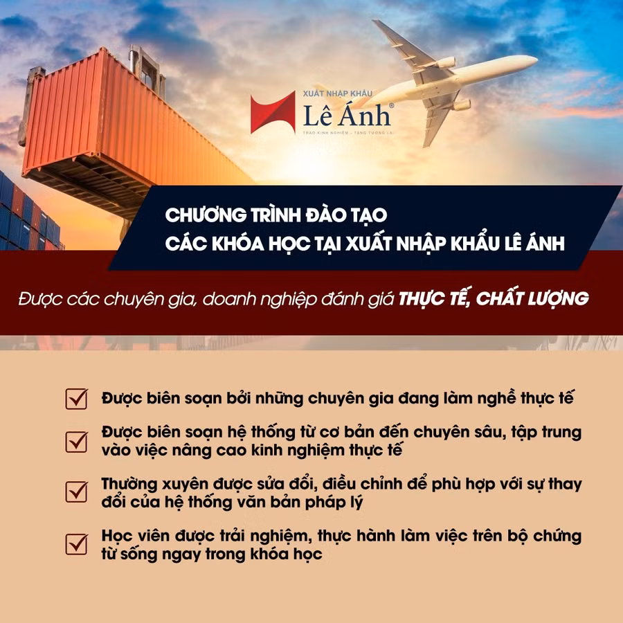 - Được biên soạn bởi những chuyên gia đang làm nghề thực tế: toàn bộ nội dung đào tạo tại xuất nhập khẩu Lê Ánh đều được qua kiểm định chất lượng bởi các chuyên gia đang trực tiếp làm nghề & chuyên gia đang giảng dạy, nghiên cứu trong lĩnh vực xuất nhập khẩu.