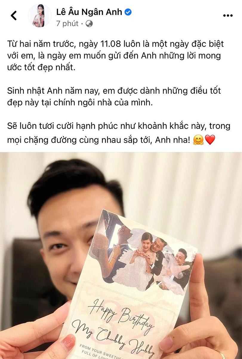 Ngoài ra, Lê Âu Ngân Anh còn đính kèm lời chúc mừng sinh nhật đầy ngọt ngào gửi đến ông xã tương lai: "Từ hai năm trước, ngày 11/8 luôn là một ngày đặc biệt với em, là ngày em muốn gửi đến anh những lời mong ước tốt đẹp nhất.