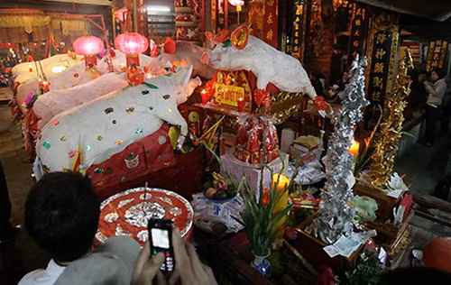 Trước ngày lễ tế khoảng 1 tuần, “ông lợn” sẽ được ăn cháo gạo nếp để thanh sạch. Ngay trước ngày lễ mang ông tế thần, người dân trong xóm sẽ dong ông đi, an ủi ông, hóa kiếp về với thánh. Đến ngày lễ hội, sáng sớm ngày 13 tháng Giêng, “ông lợn” được ăn no. Sau đó người ta trải chiếu từ cổng chuồng để rước “ông lợn” ra ngoài thịt.