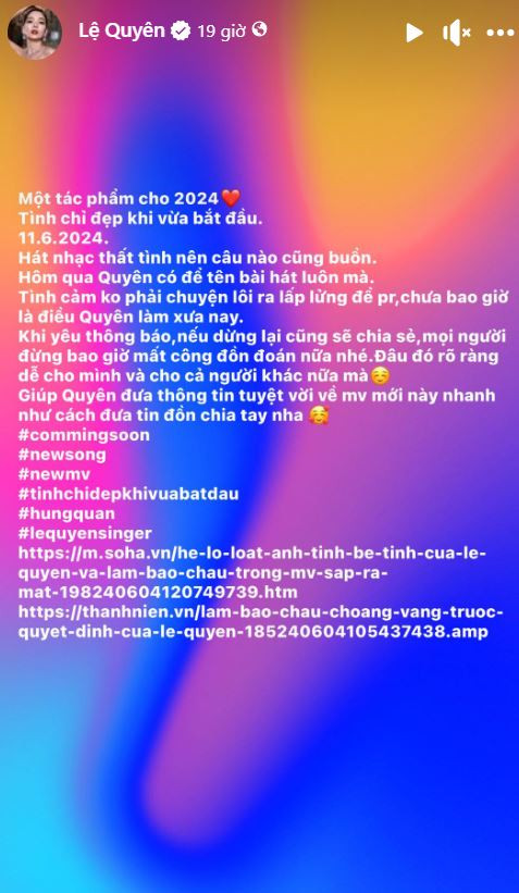 Nữ ca sĩ cho biết đó chỉ là những chia sẻ về bài hát mới của mình. Đồng thời, Lệ Quyên khẳng định sẽ luôn thông báo về chuyện yêu đương hoặc chia tay nếu có và không để mọi người phải bình luận.