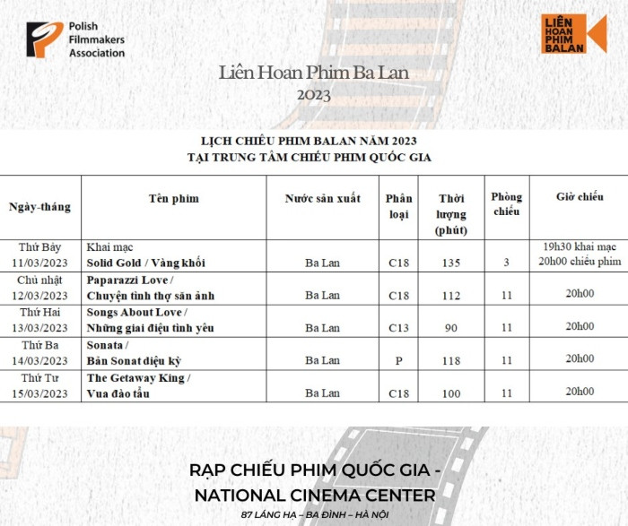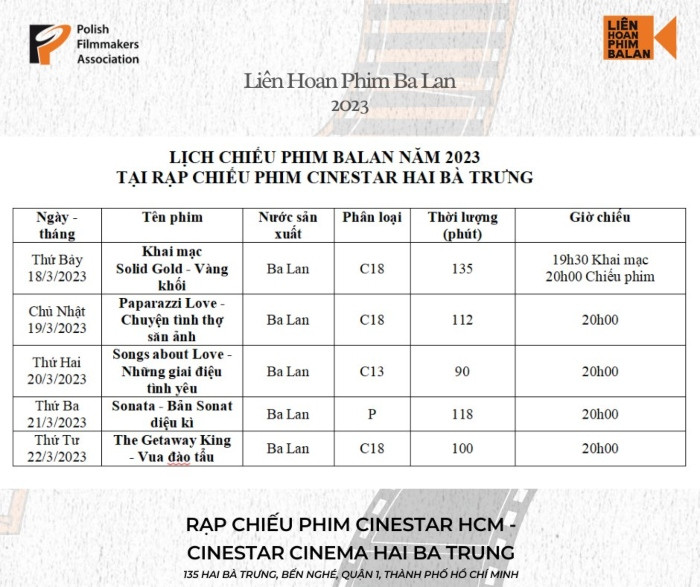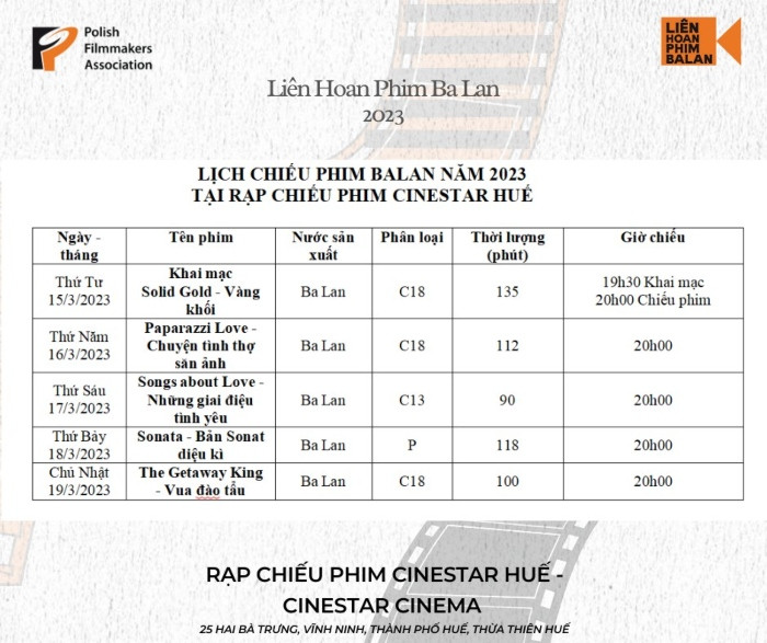 Liên hoan phim Ba Lan 2023 dự kiến diễn ra tại Hà Nội từ 11/3 đến 15/3. Tại Huế từ 15/3 đến 19/3 và bế mạc tại TPHCM từ ngày 18 đến 22/3.