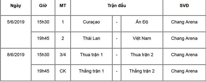 Theo kết quả bốc thăm, đội tuyển Việt Nam sẽ gặp Thái Lan ở trận ra quân, lúc 19h45 (giờ địa phương) ngày 5/6, trong khi Curacao đối đầu Ấn Độ sớm hơn, lúc 15h30. Sân thi đấu là Chang Arena, sân nhà của Buriram United, CLB mà Xuân Trường đang khoác áo.