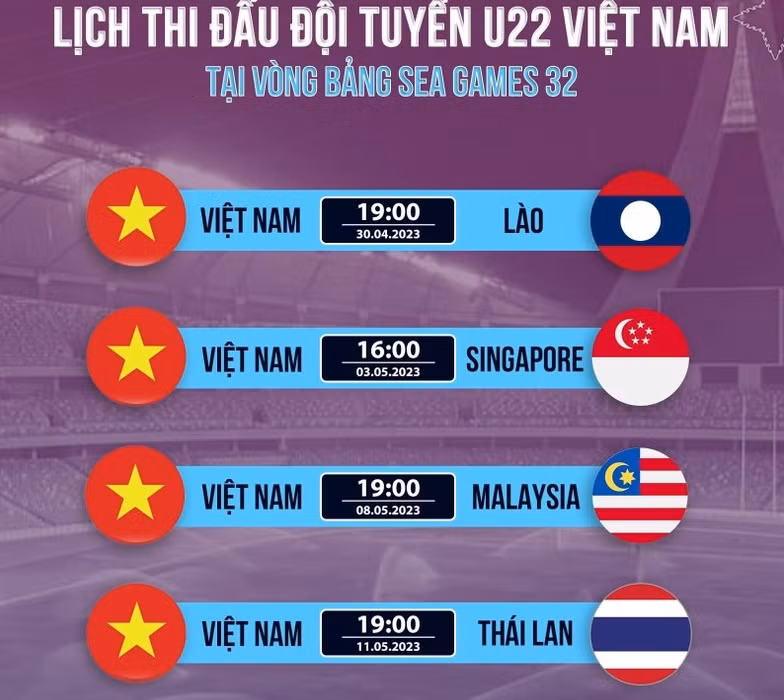 Theo lịch thi đấu của U22 Việt Nam tại SEA Games 32, thầy trò HLV Troussier lần lượt gặp Lào, Singapore, Malaysia và Thái Lan.