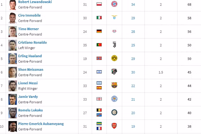 Messi đang xếp thứ 7 với 44 điểm (22 bàn) và rất khó có cơ hội để vượt qua Lewandowski trong danh sách này. Những người còn lại trong top 10 là Jamie Vardy (Leicester City, 42 điểm), Romelu Lukaku (Inter, 40 điểm), Aubameyang (Arsenal, 38 điểm).